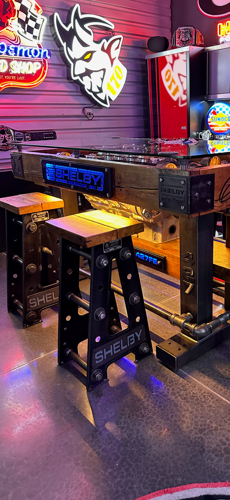 This unique set of Industrial Barstools is a must-have for any automotive enthusiast. Each stool is a one-of-a-kind piece, carefully crafted by hand in our Farmington, Minnesota workshop at Machine Age Lamps. Made from heavy-duty 12-gauge steel and featuring the official Carroll Shelby snake and logo, these stools blend rugged industrial design with iconic automotive heritage. They are made to order and will be ready to ship in approximately two weeks.