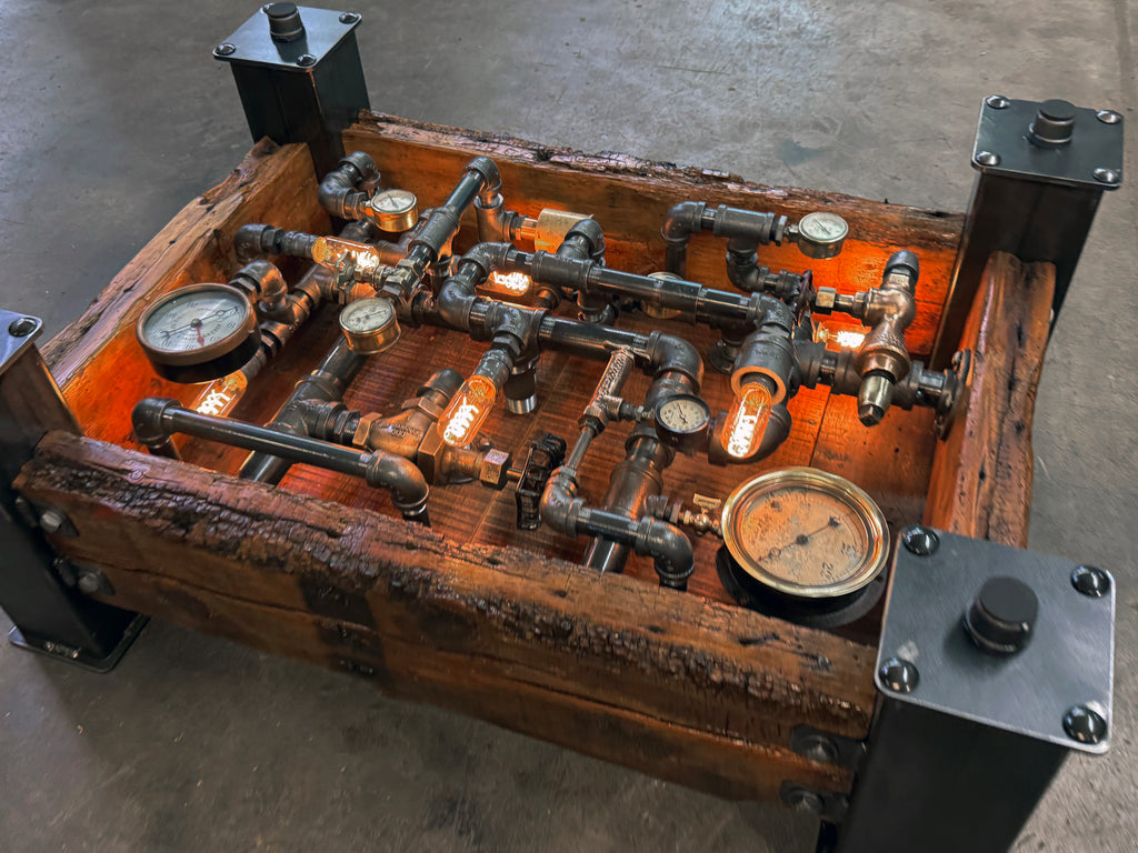 - This pipe table stands out as one of our most intricate creations, featuring multiple vintage pressure gauges, valves, steam whistles, and railroad components.