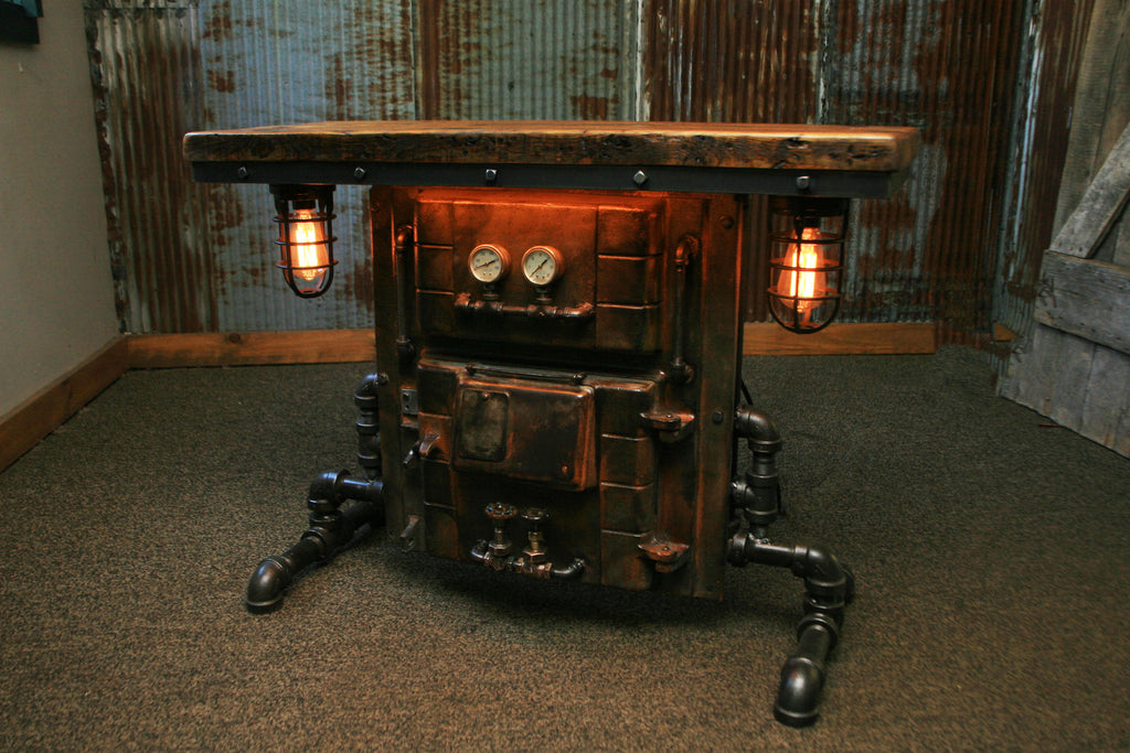 - Led lighting mounted to underside of table to top to illuminate the stove door and gauges