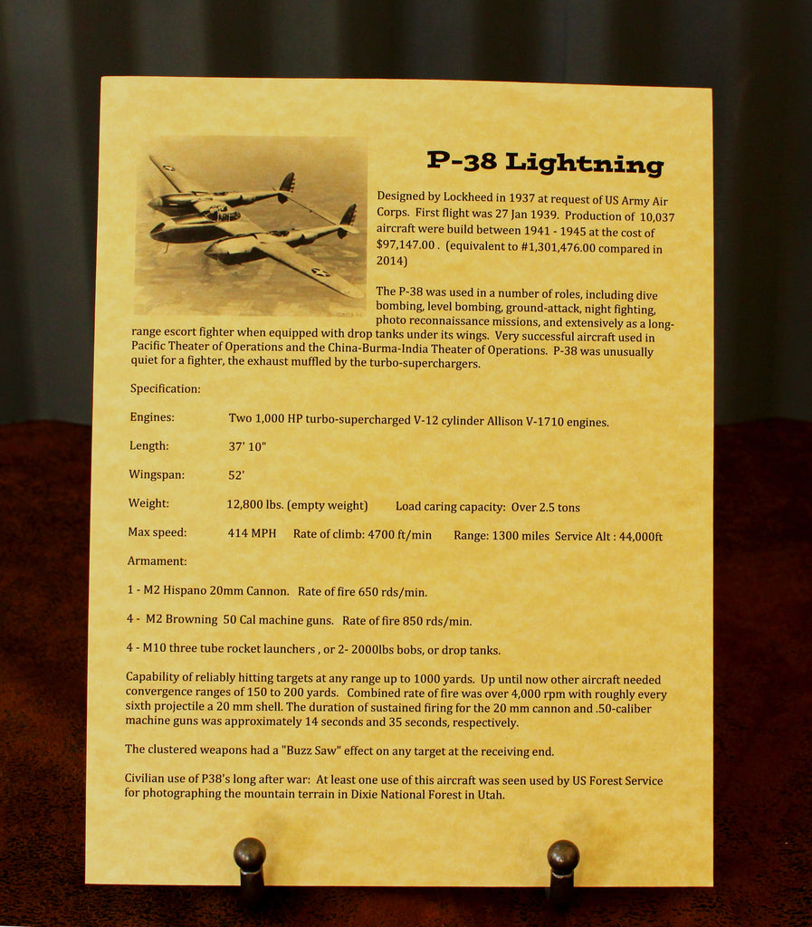 - Document listing history of the P-38 aircraft with specifications is included with lamp.