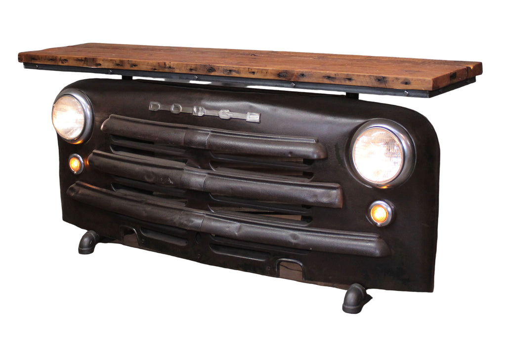 - This table boasts an authentic antique Dodge 1949 truck front end, with a one-of-a-kind top crafted from 100 year old barnwood sourced from Minnesota, USA. The natural aging patterns only enhance its charm, and for added protection, a light clear coat has been applied.