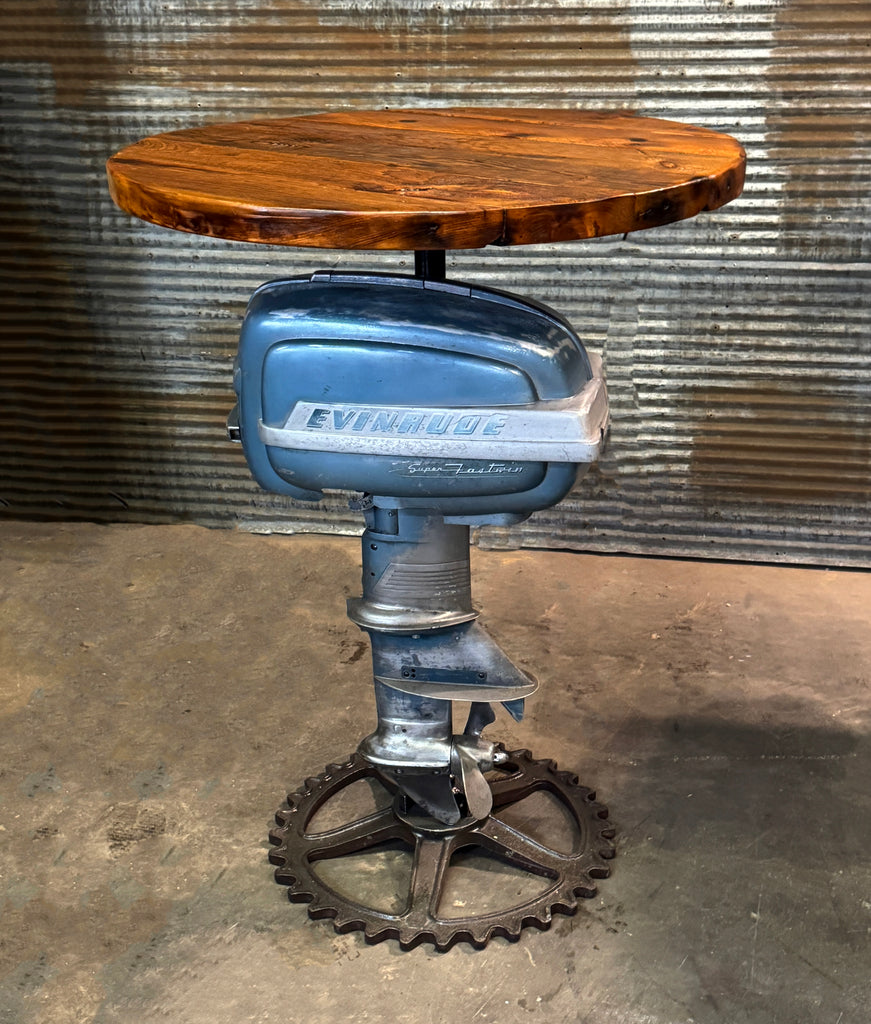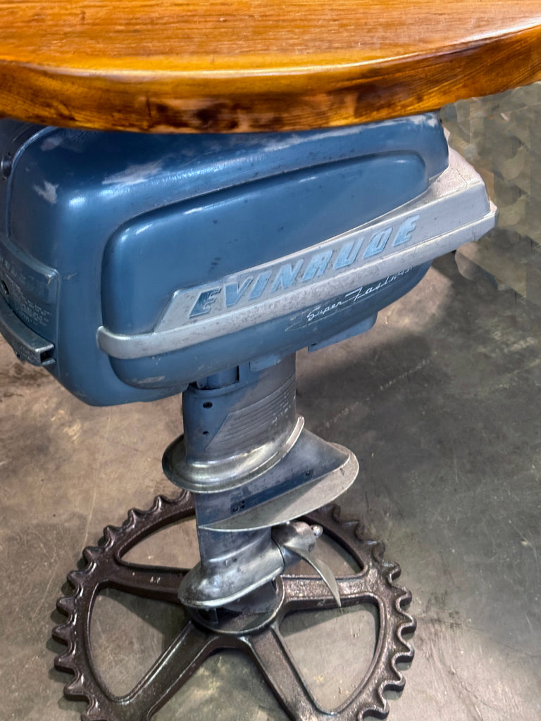 - This pub table features an Antique Evinrude Boat Motor, in its original paint finish, from the 1950s. The lower unit has been removed of all fluids and internal parts clear coated. The motor has also been removed.