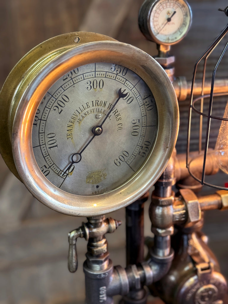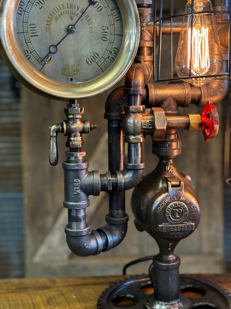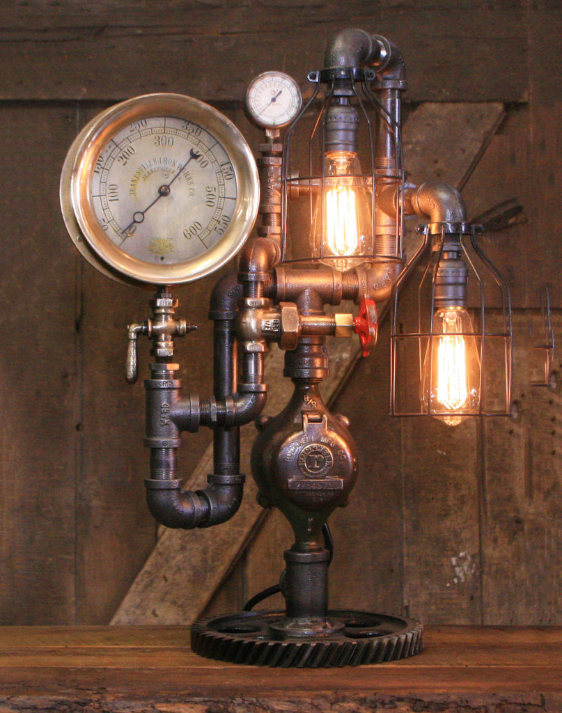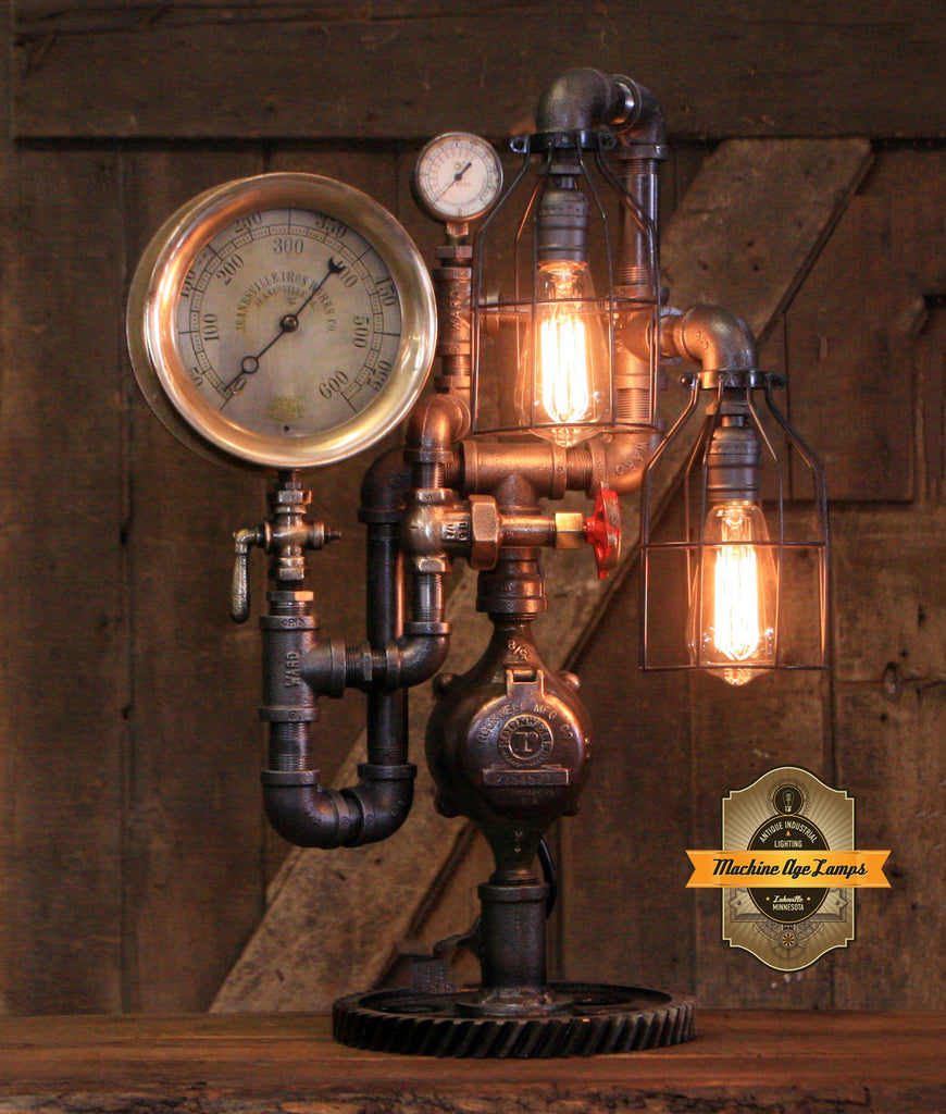Steampunk Industrial / Antique Steam Gauge / Gear Base / JeanevilleL / lamp #4255