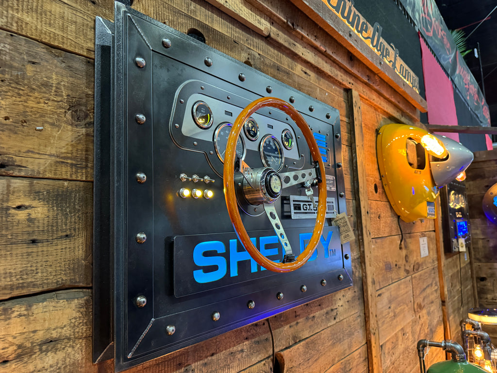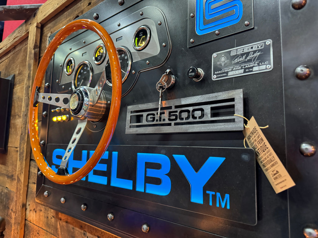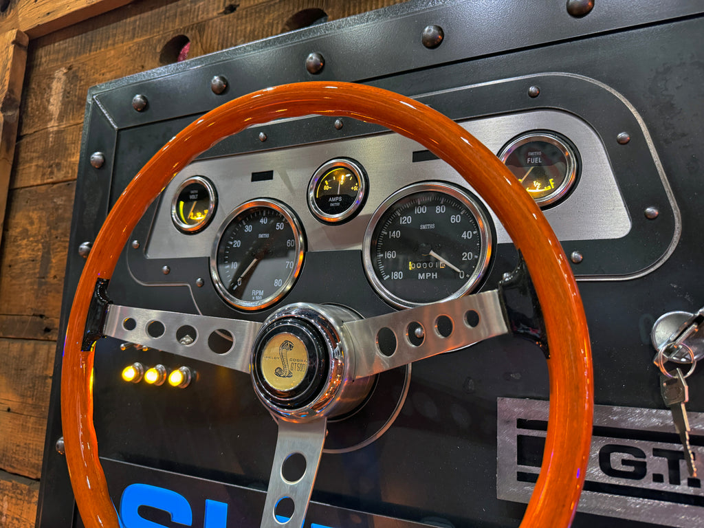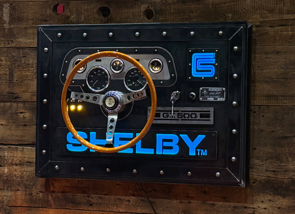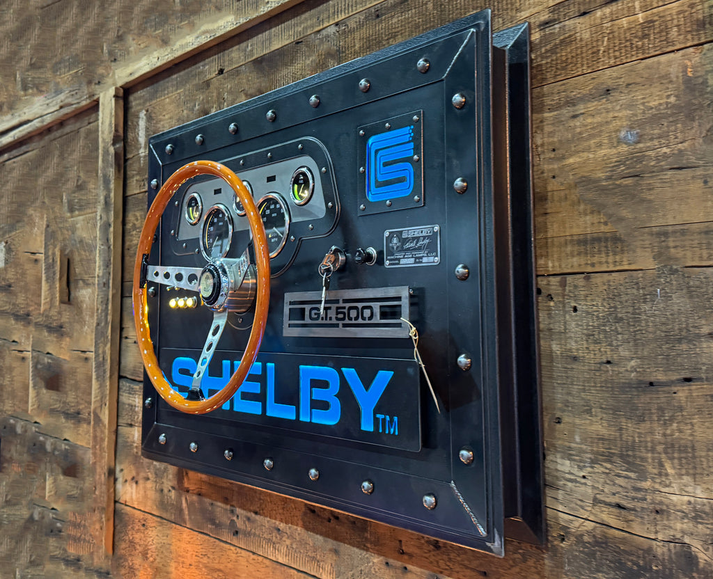 - This unique creation pays homage to Carroll Shelby and his racing legacy. Made from 1/8 heavy gauge steel, it features a wood GT-500 steering wheel designed for a 1967 GT-500. The GT dash panel has been recreated using Smiths gauges, and it also includes racing-inspired toggle switches with orange LED indicator lights.