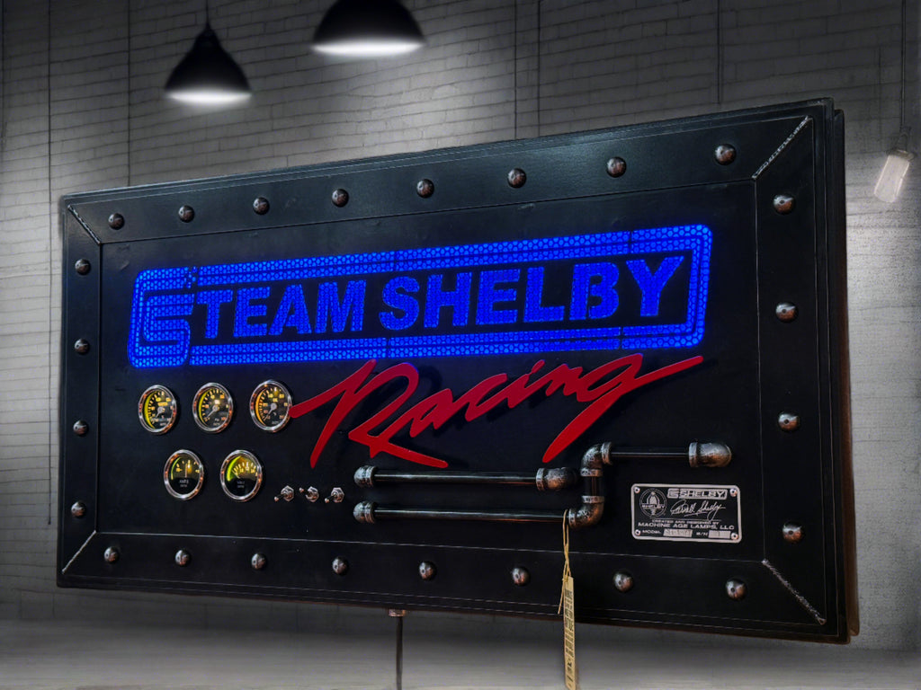 - This wall sconce is a truly unique tribute to Carroll Shelby and his renowned brand. Crafted from sturdy 1/8 steel and carefully welded and riveted, it exudes the rugged spirit of team racing. Complete with racing-inspired toggle switches and gauges, it's the perfect addition to any automotive enthusiast's decor.