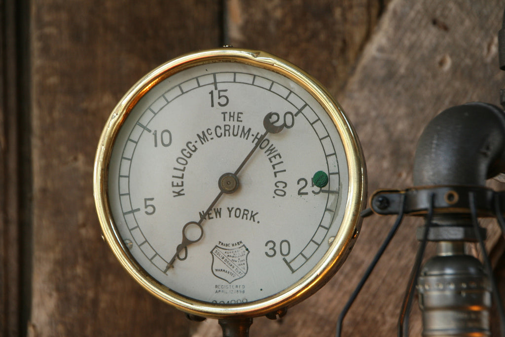 This design is made to order and may take up to 4 weeks to ship. We will assemble the same structure using similar antique pressure gauges.
