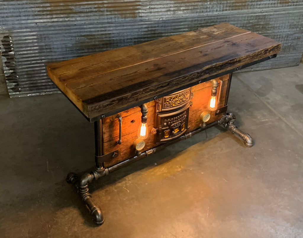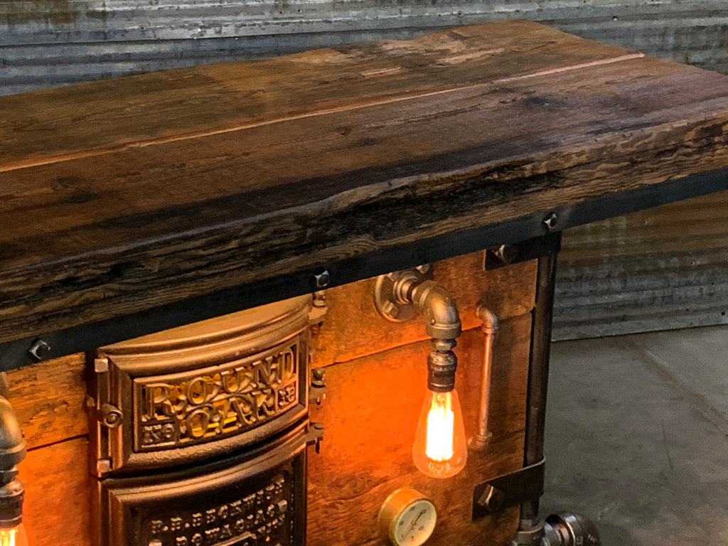 Antique Steampunk Industrial Boiler Door Table Stand / Round Oak / Reclaimed BarnWood Top - #2774