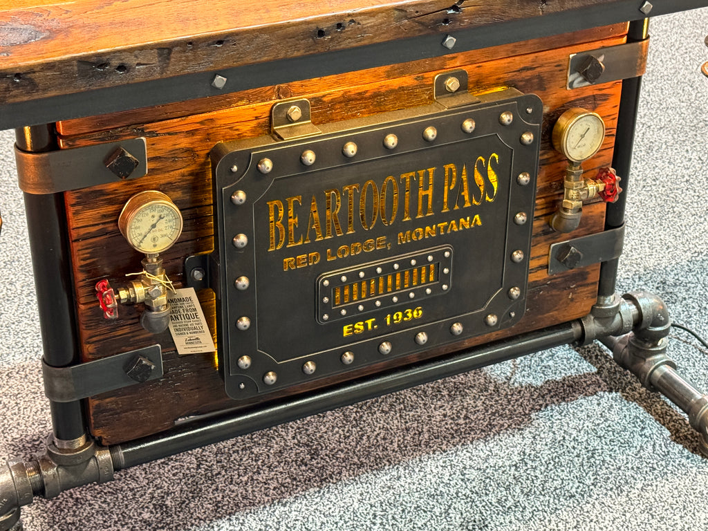 - writing on front of boiler door “ Beartooth pass red Lodge, Montana”
