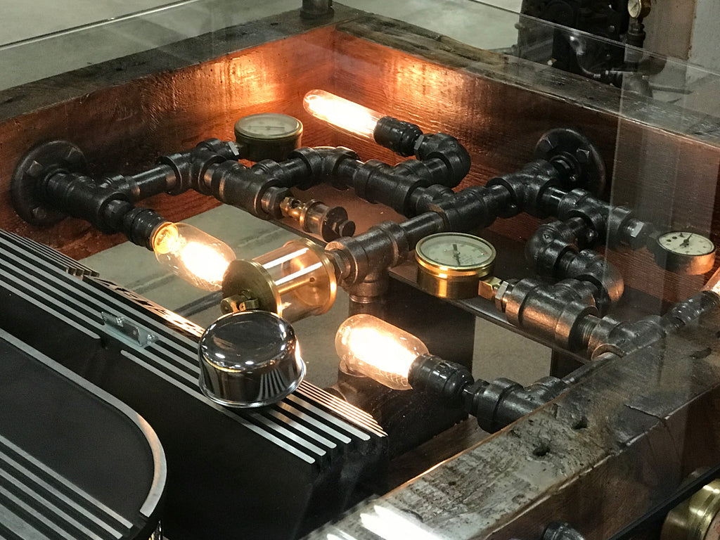 - Barnwood Timbers create the frame with a design of Pipes and Gauges and lights on the inside