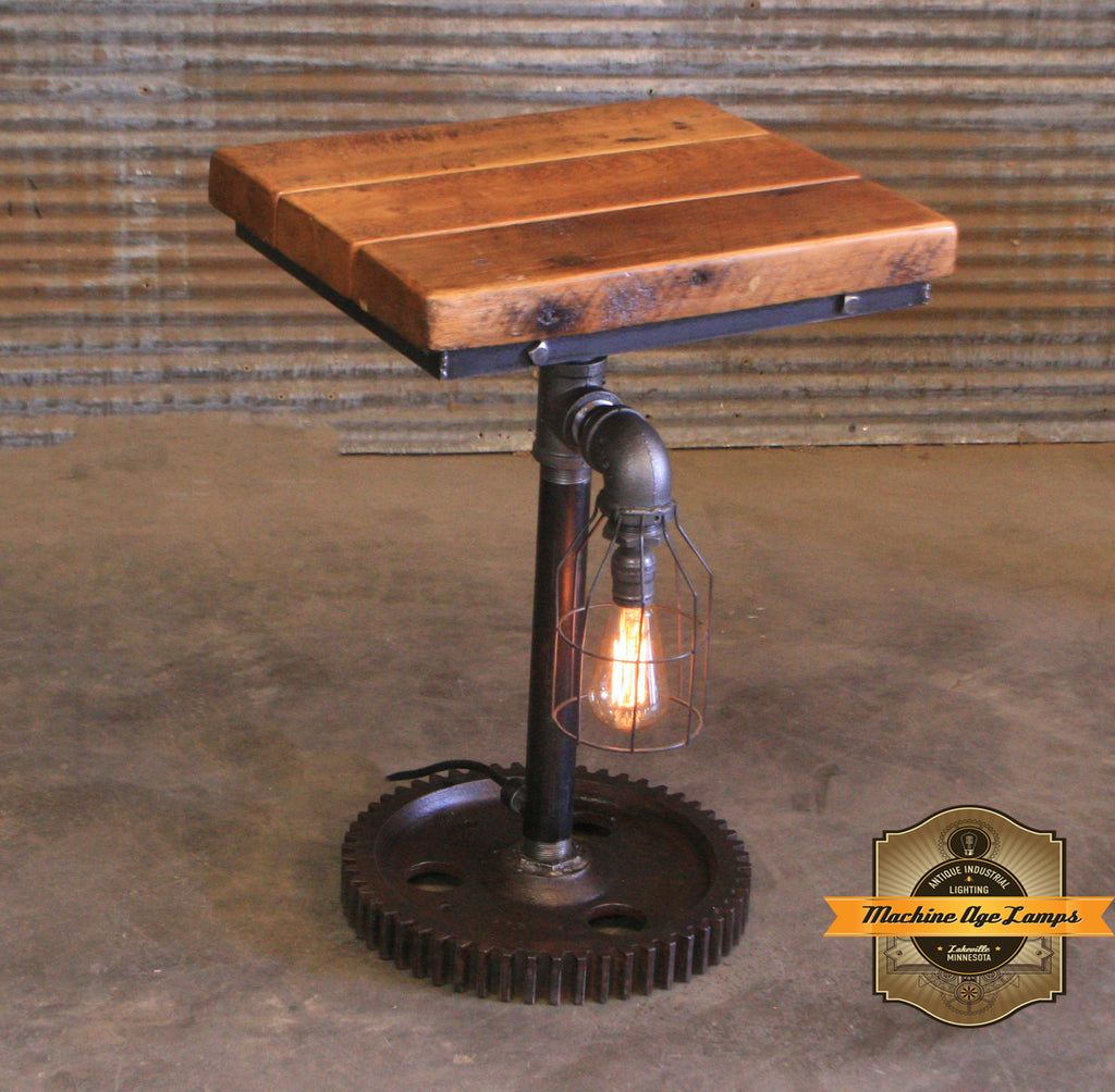 This Industrial Side Table features a classic barnwood top measuring 17 by 20 inches, and an ornamental metal band around the lip. Its base is made from a vintage John Deere tractor gear, from the 1930s. A single light is fitted with an on/off switch on the back of the piping.