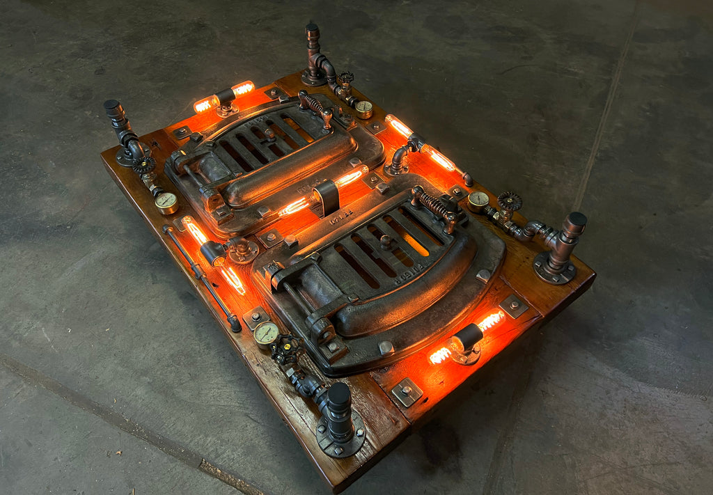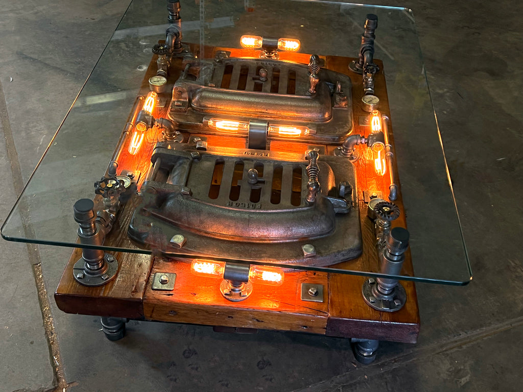 This table sold May 2024, we have 2 more antique boiler doors, we can build another, please allow 5 weeks to ship.