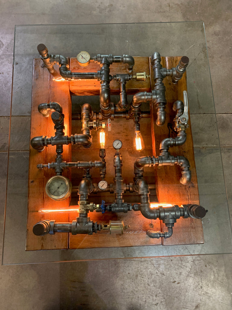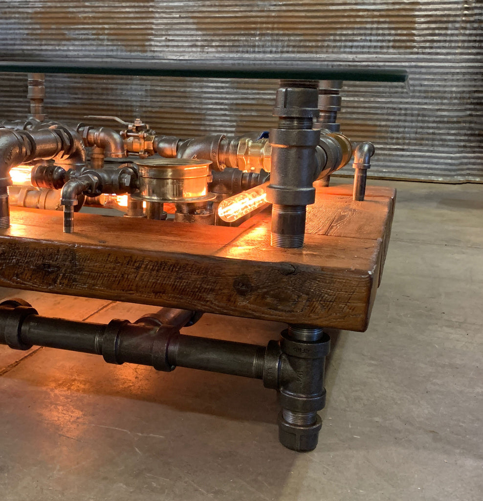 Steampunk Industrial Barnwood Coffee Table / Machine Age Lamps / Steam Gauge Table #2517