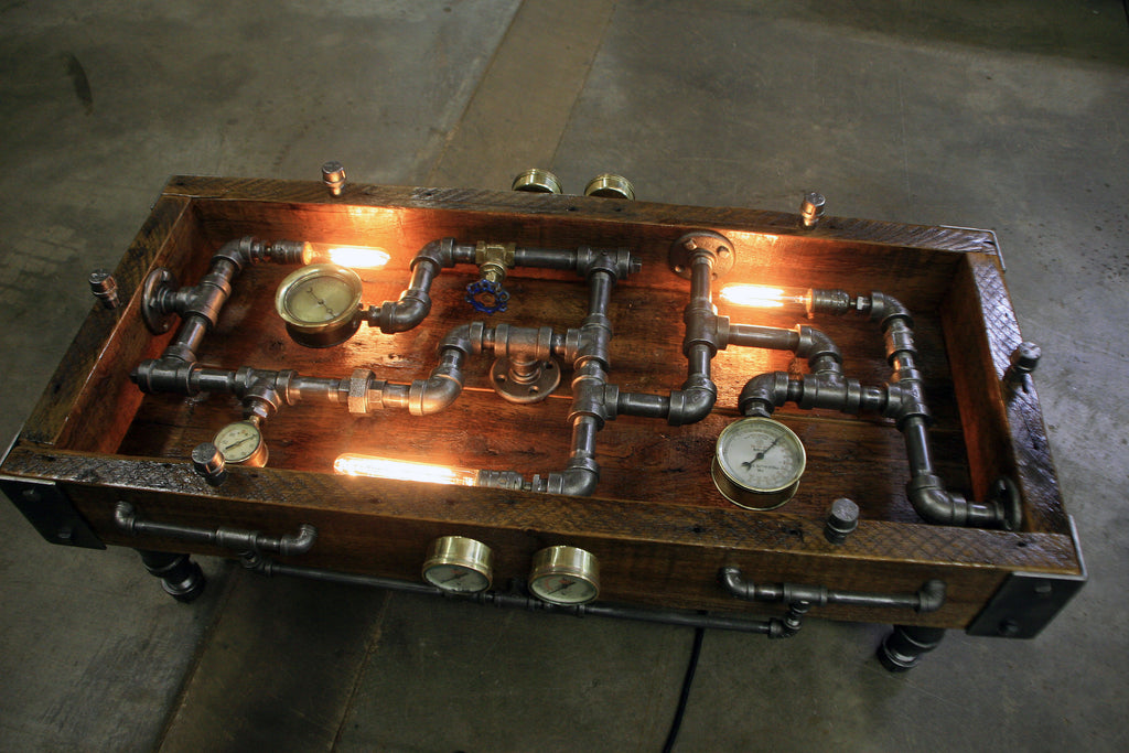 Steampunk Industrial Table / Coffee / Barn Wood / Gauges / Glass / Table #1750