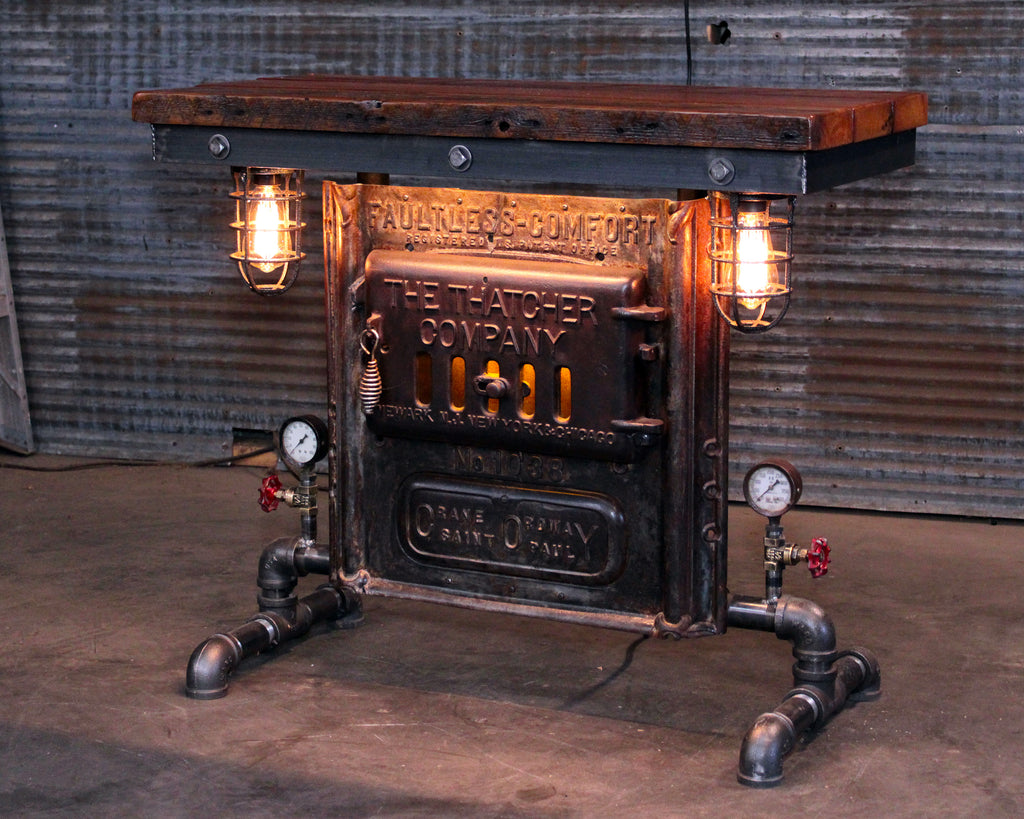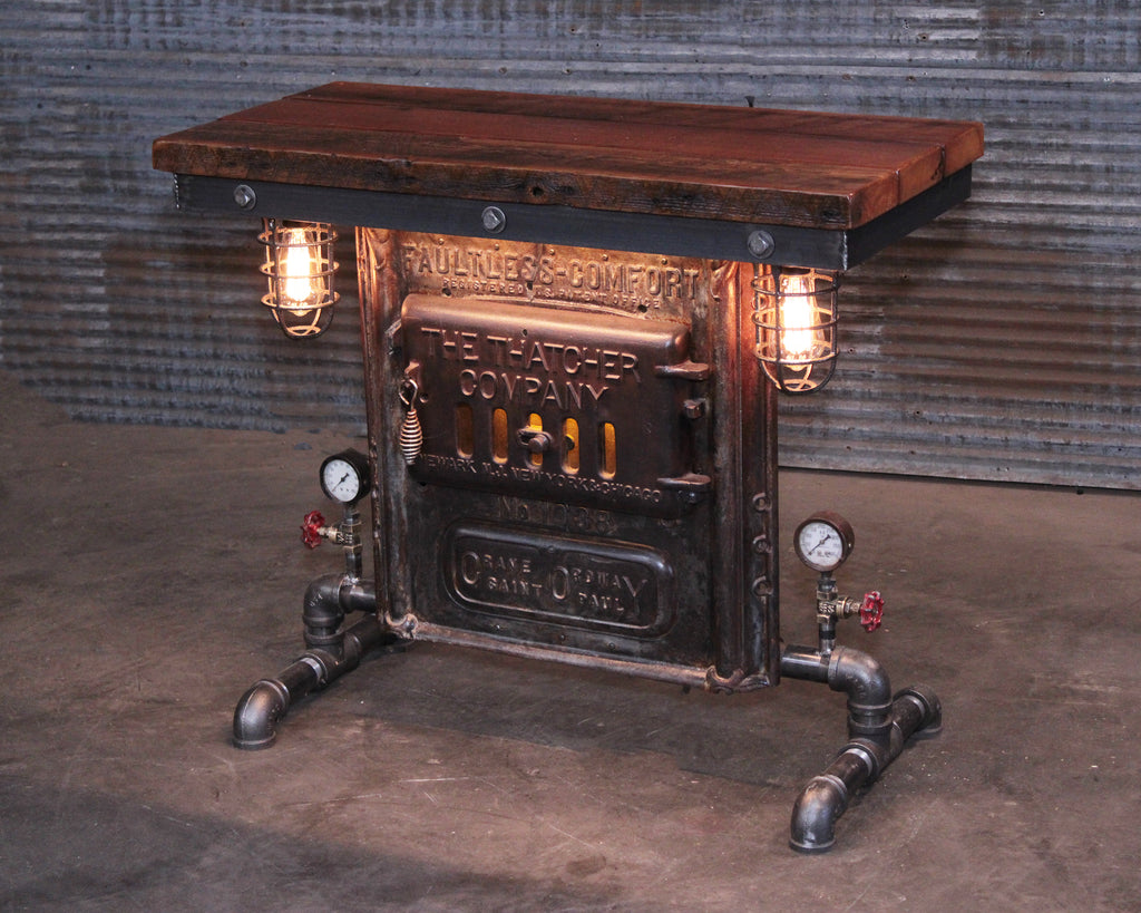 Steampunk Industrial Table / Pub, sofa console / Antique Furnace Door / Barnwood / Table #4473