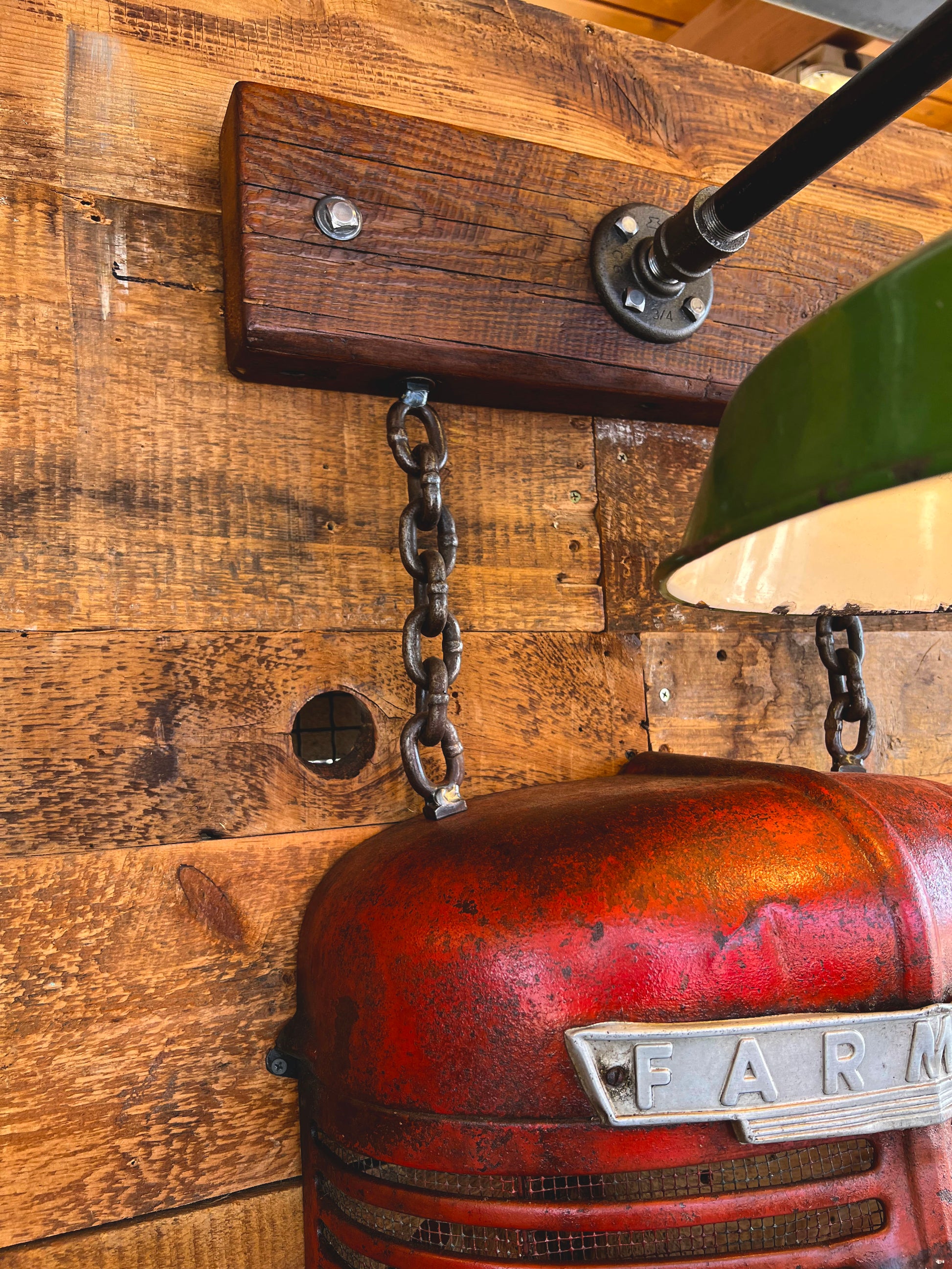 Original Farmall tractor front end (radiator cover) hangs with old logging chain from the lighting structure