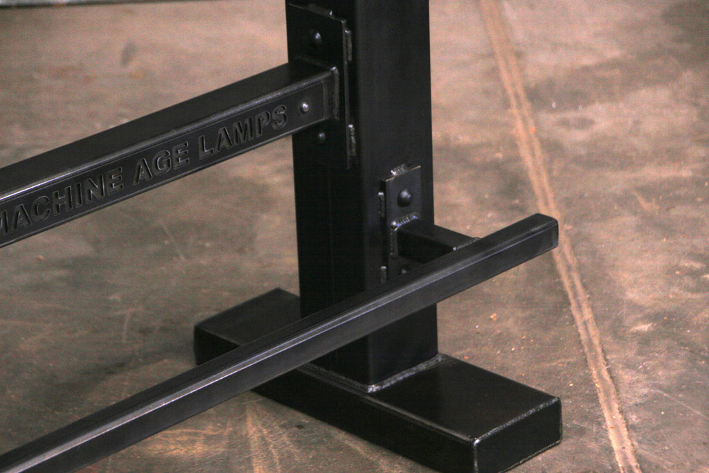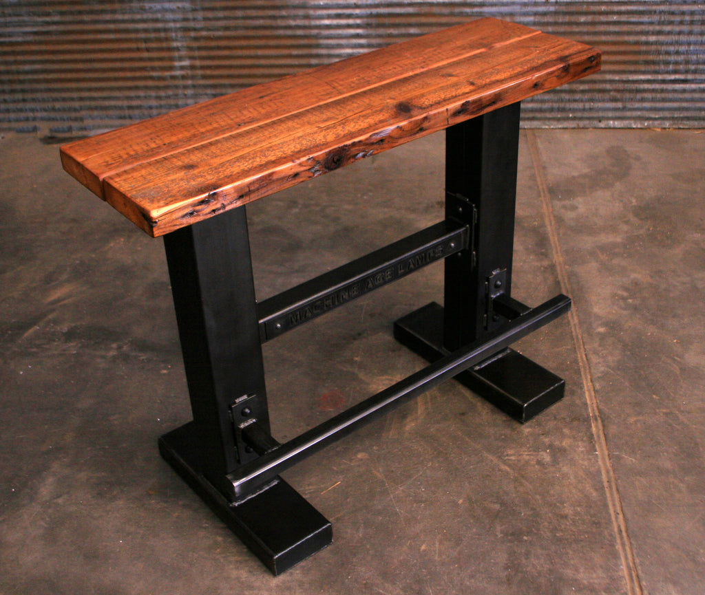 - Heavy-duty industrial iron base bench with a Barnwood top