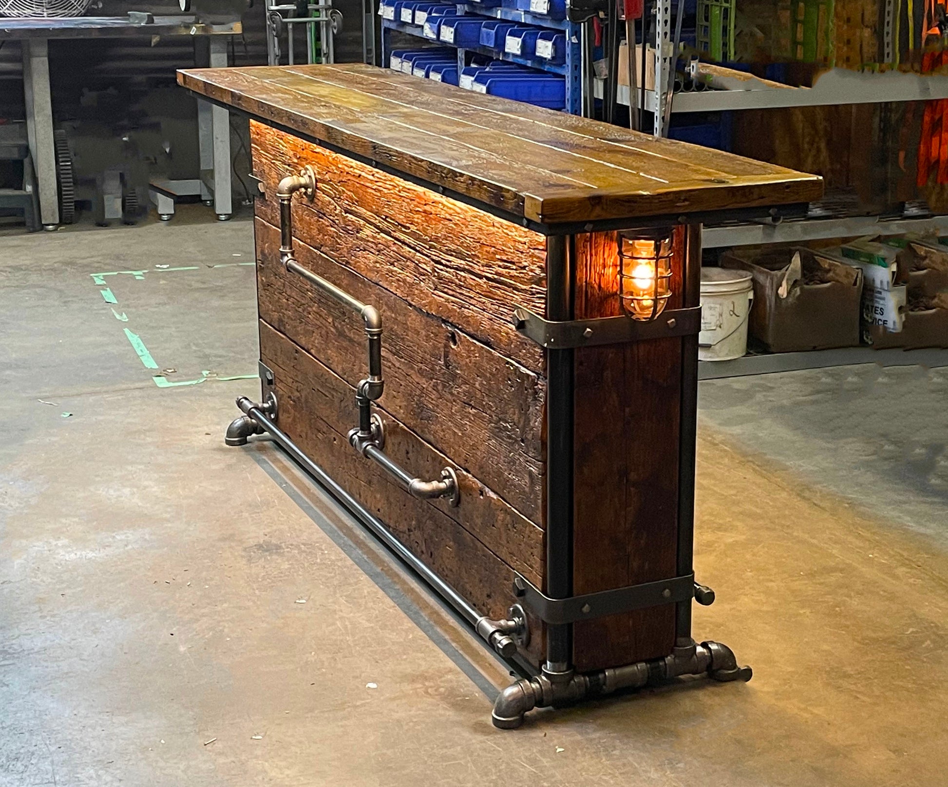 Make a commanding first impression with this handcrafted 8-foot industrial bar and hostess stand. Perfect for high-end restaurants, breweries, or home bars, this piece is built from authentic 100-year-old Minnesota barnwood and rugged steampunk industrial steel. Every inch reflects the "Grandfather of the Movement" quality that Shawn Carling is known for—offering a durability and soul that modern mass-produced furniture simply cannot replicate. This custom made table serves as a functional masterpiece, providing ample space for guests while anchoring your room with genuine American heritage. Secure this one-of-a-kind center-piece today!