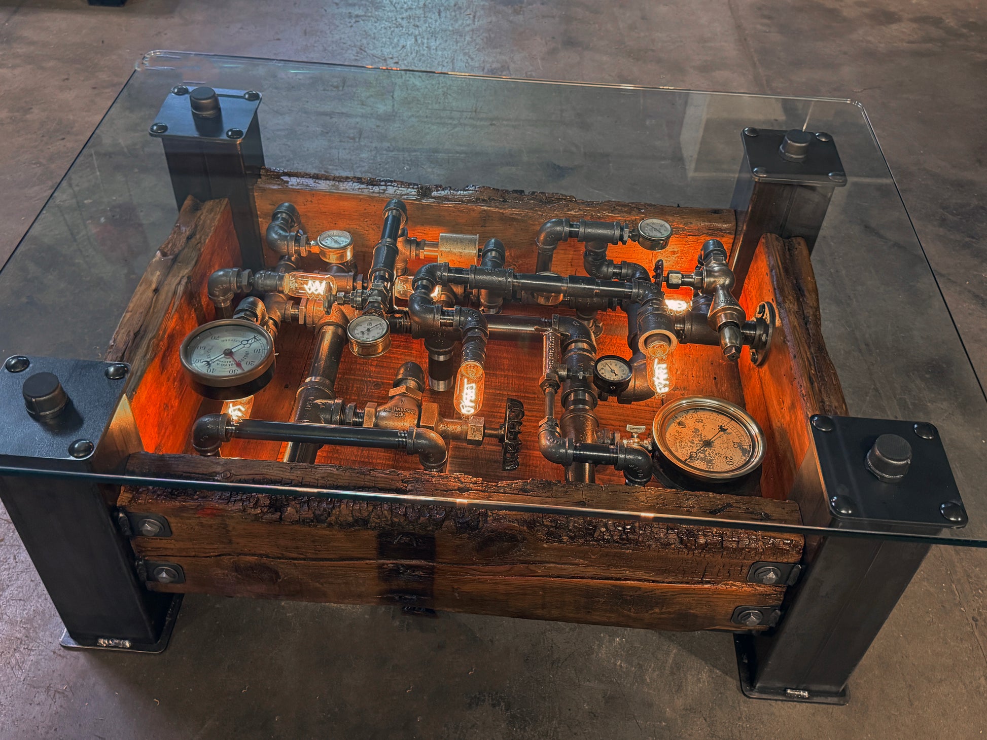 - This pipe table stands out as one of our most intricate creations, featuring multiple vintage pressure gauges, valves, steam whistles, and railroad components.