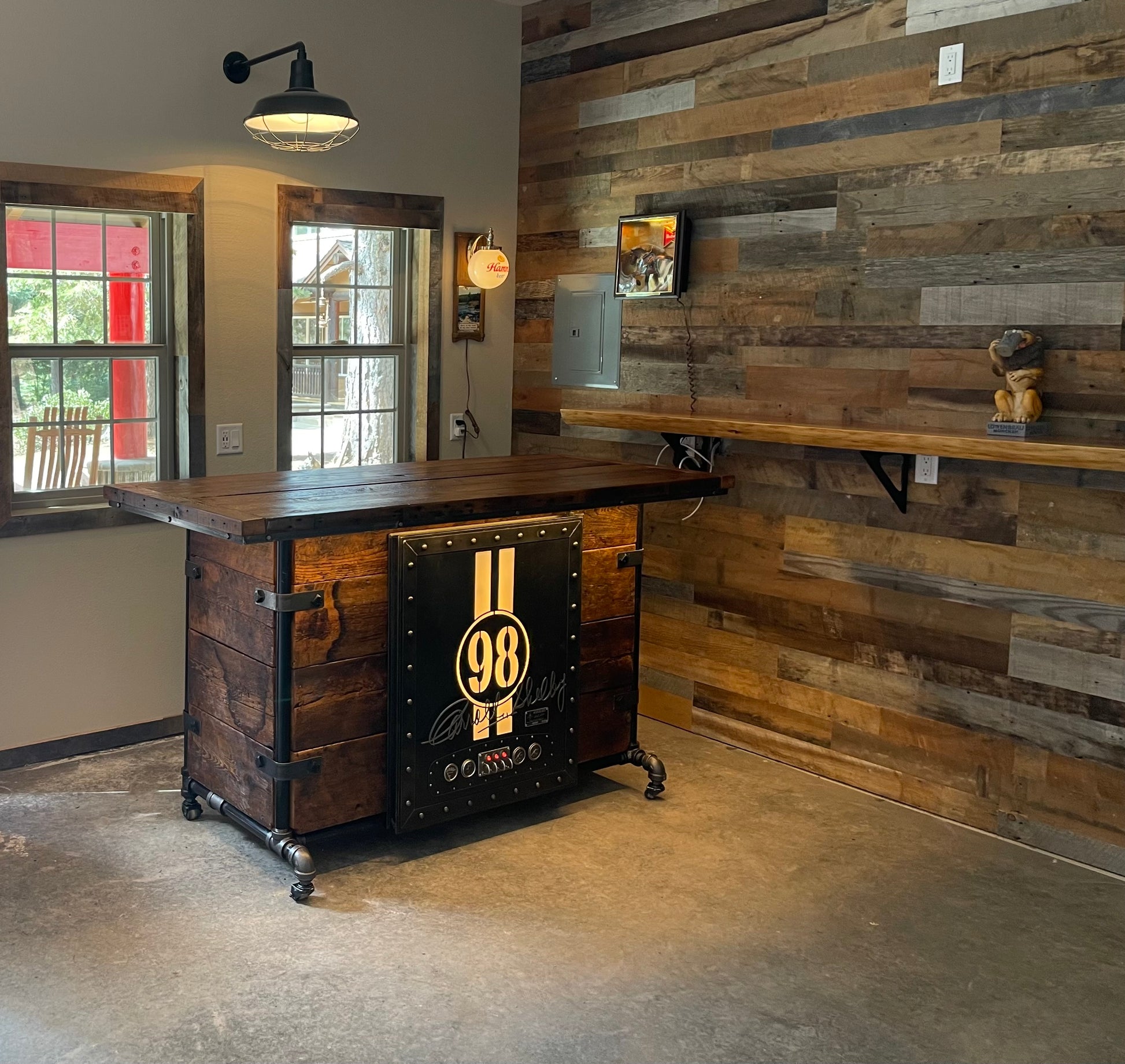 A stunning centerpiece for any automotive enthusiast, this custom steampunk industrial bar from Machine Age Lamps is handcrafted from authentic reclaimed timbers from a late 1800s Minnesota barn. Built to order with an estimated two-week lead time, this bar features a bold, large Carroll Shelby door emblazoned with the iconic "98" and equipped with genuine Stewart Warner gauges.